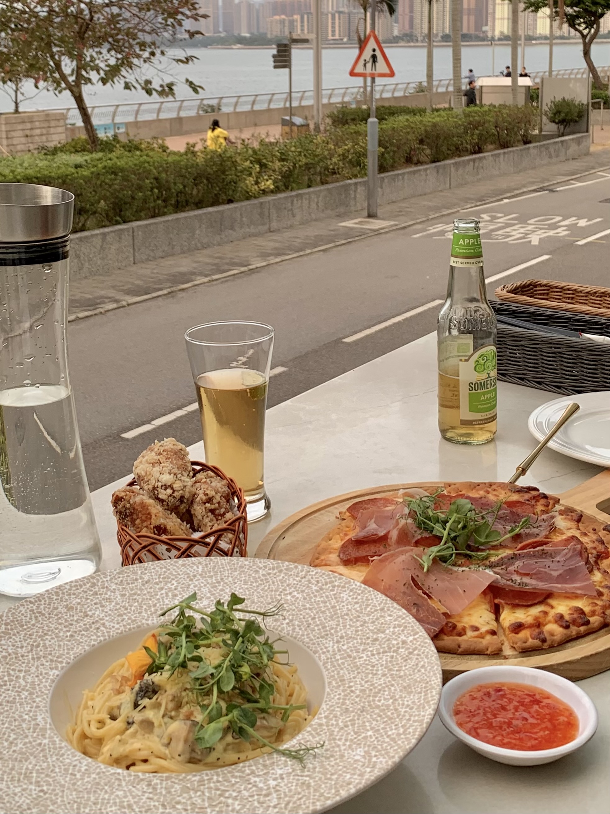 바람 부는 야외 테라스에 앉아 먹는 🍺 + 🍕 피맥 조합 최고! 사이드로 시킨 치킨이 제일 맛있고, 피자와 파스타 맛은 아주 평범해요 그렇지만 (특히 중문대 분) 멀리 가긴 귀찮고 조금은 특별하고 싶은 날 추천합니다!! 🫶🏻