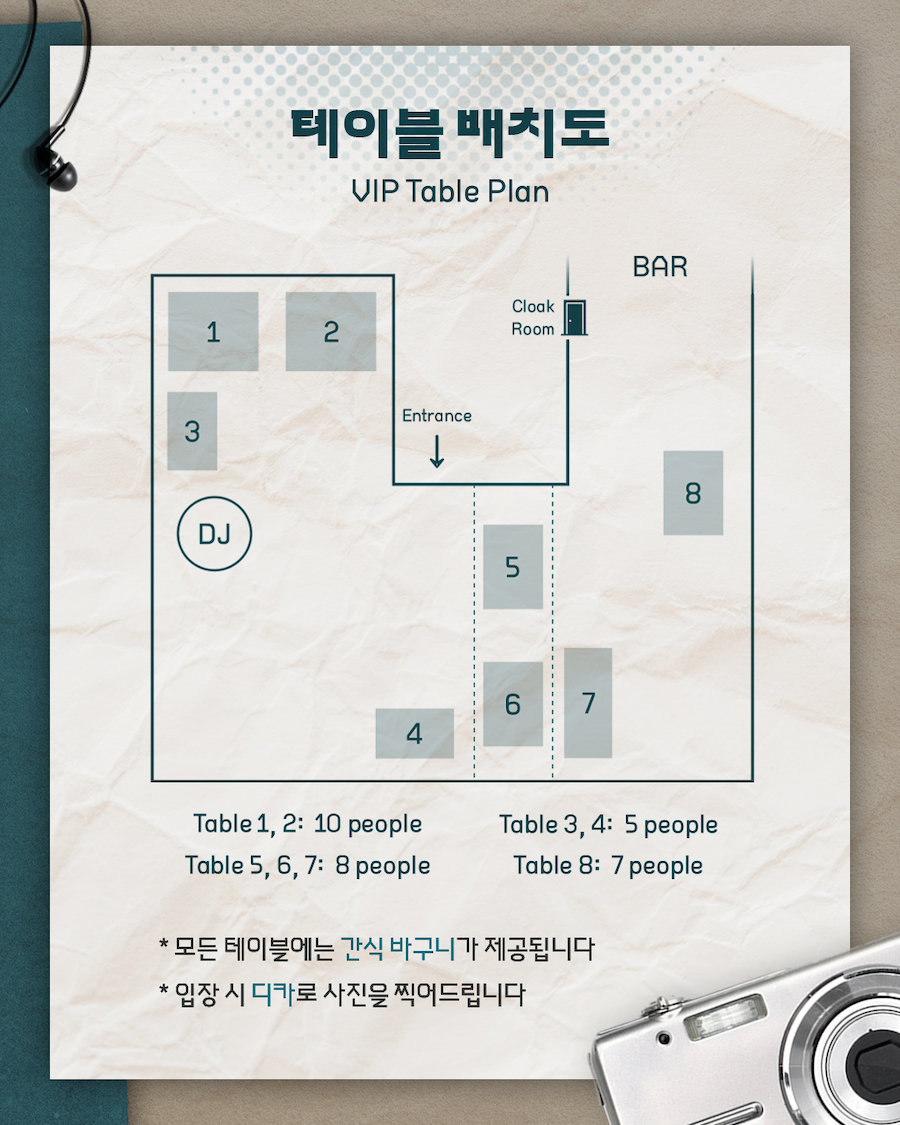 •🪩지지고 복-고 ✨ Party에 와주시는 여러분들을 위해 저희가 준비한 이벤트와 테이블 플랜을 소개합니다! Event Details <다시 돌아온 🔥추억의 뽑기🔥이벤트!> 1등: 바틀 (2명) 2등: 칵테일 Free shot (3명) 3등: Free Shot (9명) 4등: 추억의 불량식품 세트 <좋프❤️ 이벤트> 게시물에 좋아요 ❤️ 누른 인원 중 무작위 5명 추첨해서 Free Shot 🥂 증정!! *추첨 이벤트는 선예매로 티켓을 구매해주신 분들에게만 적용됩니다. 당첨자는 인스타로 연락드릴 예정입니다. * 뽑기 이벤트는 파티 입구에서 진행됩니다. 입장 전 뽑기판을 확인해주세요! VIP Table Plan 🔥Special Packages : ✨Moet Chandon X2 £300 ✨Moet Chandon X3 £450 * 테이블 당 미니멈 오더는 바틀 한병입니다. 🪩ALL Tables £30 per person 🎈Table 1, 2: For max 10 people 🎈Table 3, 4: For max 5 people 🎈Table 5, 6, 7: For max 8 people 🎈Table 8: For max 7 people * 테이블 인원은 티켓 구매 구글 폼을 작성하지 마시고 인스타그램 @_jinn0y_ 카카오 아이디 jinyoungk0126 으로 연락 주세요!! 📢Table benefits for VIPs 📣테이블 손님들은 테이블 전 인원 도착 시 큐점프가 가능합니다! 📣모든 테이블에 자유롭게 드실 수 있는 불량식품 바구니🍭🍘가 놓여질 예정입니다~! 📣테이블 신청 인원 한해서 디카로 사진을 찍어드리는 포토 이벤트📷✨도 진행할 예정입니다~!