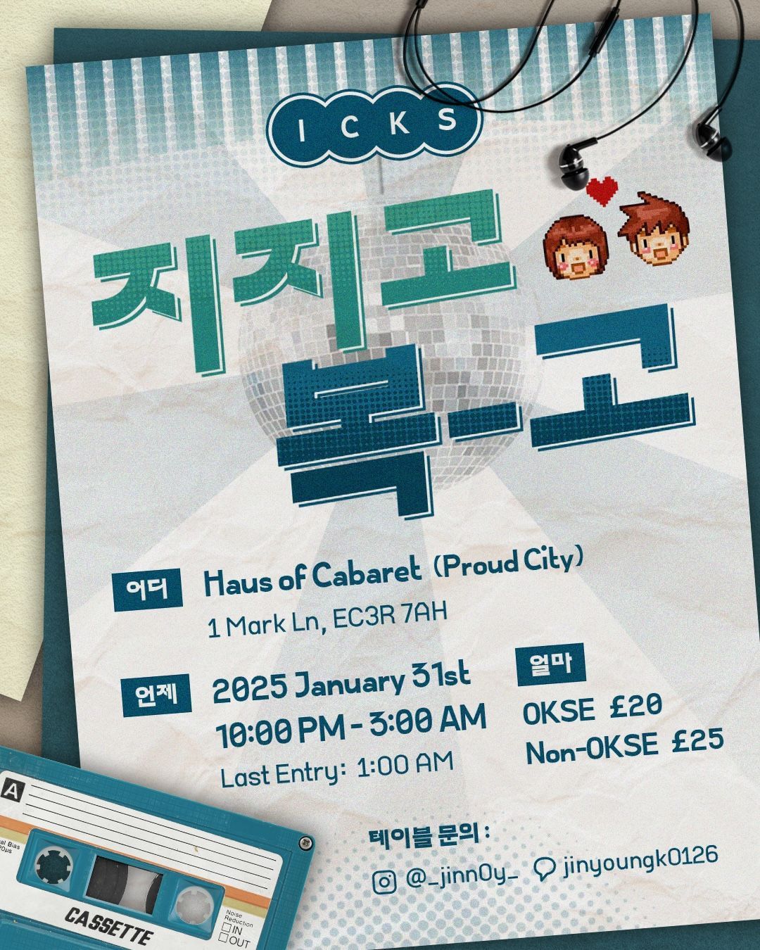 이번엔 복고다 🤩🕺 청춘은 바로 지금!👖🎉 우리 초딩때 만났는데 벌써 20대야아...! 🥺 추억의 2000-2010년대 그 시절, 지금 대학생인 우리가 잼민이였던🧒🏻 그때로 돌아가⏳🔙 저희 ICKS가 준비한 새해 첫 파티 🪩 지지고 복-고 🪩 에서 추억 팔이도 하-고 🥹🥂 신나게 춤도 추-고 🕺🏻💃 너랑 나랑 지지고 볶-고 😳🤭 함께 이 밤을 불태울 🔥준비 되셨나요? 🥳💃 📍장소: Haus of Cabaret (Proud City) 1 Mark Ln, EC3R 7AH 📅 날짜: 2025년 1월 31일 10:00PM ~ 3:00AM (last entry 1:00AM) 🎟️ 티켓 가격: 선예매 - £20 (OKSE) / £25 (non-OKSE) 워크인 - £25 👔 드레스코드: 데님 / 레트로 ⭐️ https://forms.gle/dSDGYLPzpTYgz6XEA ✨ ‼️NO ID, NO ENTRY‼️ ⛔️선예매 티켓은 환불/양도 불가입니다. 추후 다양한 선예매 + VIP 테이블 이벤트 관련 정보도 올라올 예정이니 많은 관심 부탁드립니다!🤩 📢테이블 문의: Instagram - @_jinn0y_ Kakao - jinyoungk0126