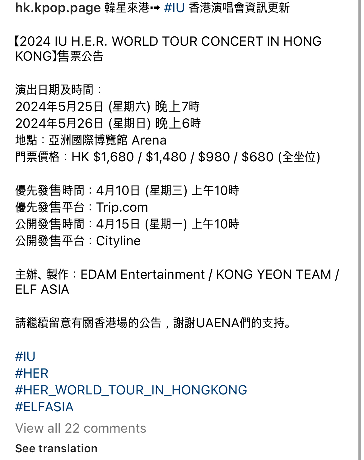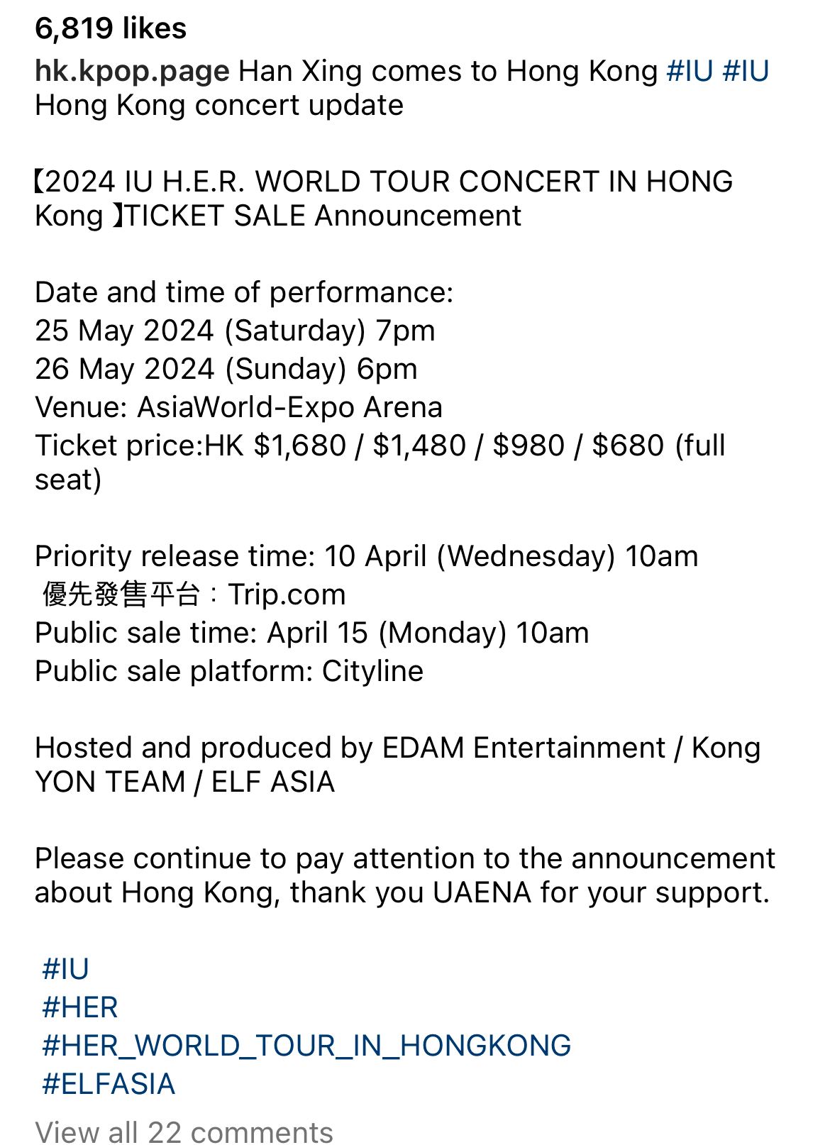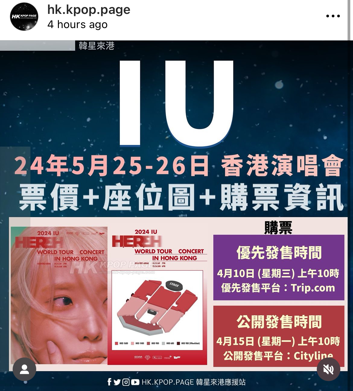 아이유 콘서트 홍콩 정보 떴네요! 5/25-26, 티켓팅은 4/10 (트립닷컴 선예매) & 4/15 (본티켓팅) 인듯 싶습니다! 가시는 분들 부디 티켓팅 성공하시길!!! 🍀🤞😉