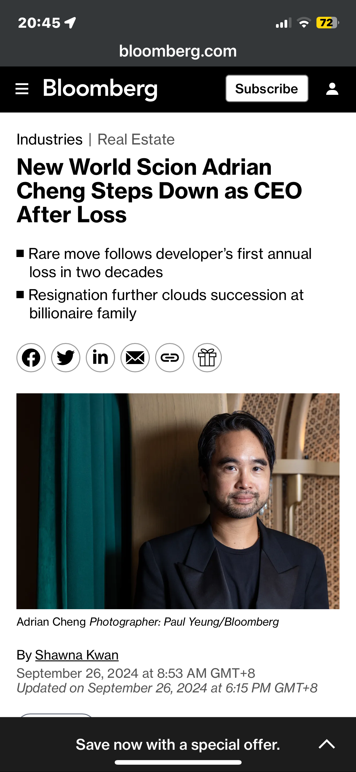 오랜만에 모멘텀에 올리는 홍콩 빅뉴스: K11 로도 유명한 뉴월드 사장 에드리안 청 짤림. https://www.bloomberg.com/news/articles/2024-09-26/new-world-development-halts-trading-amid-ceo-departure-reports