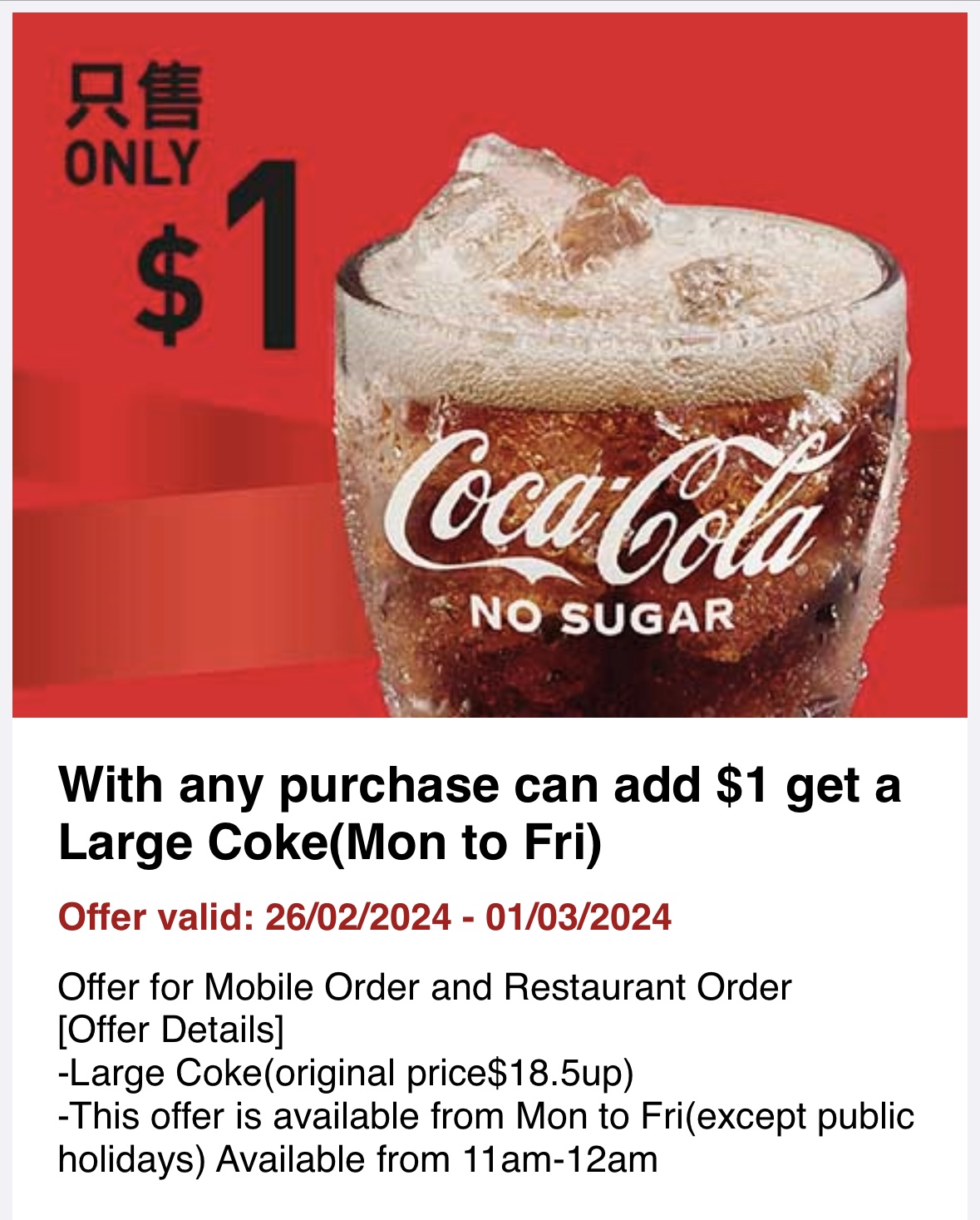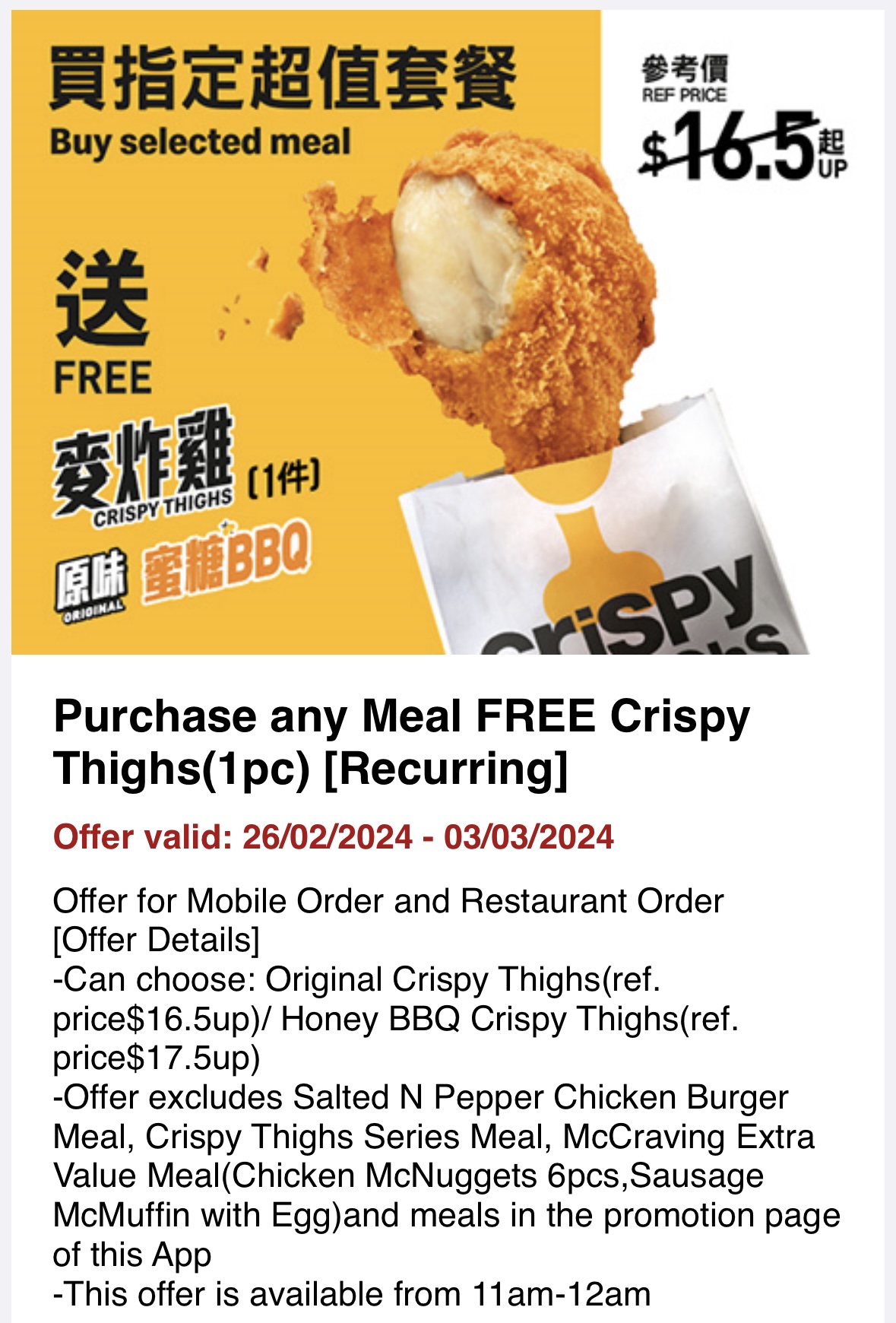 [금주 맥날 꿀🍯 할인정보] 2월 26일부터 3월 3일까지 버거 세트 주문시 Crispy Thigh 1개 무료쿠폰 2월 26일부터 3월 3일까지 모든 제품 주문시 콜라 라지 1$ 추가 쿠폰