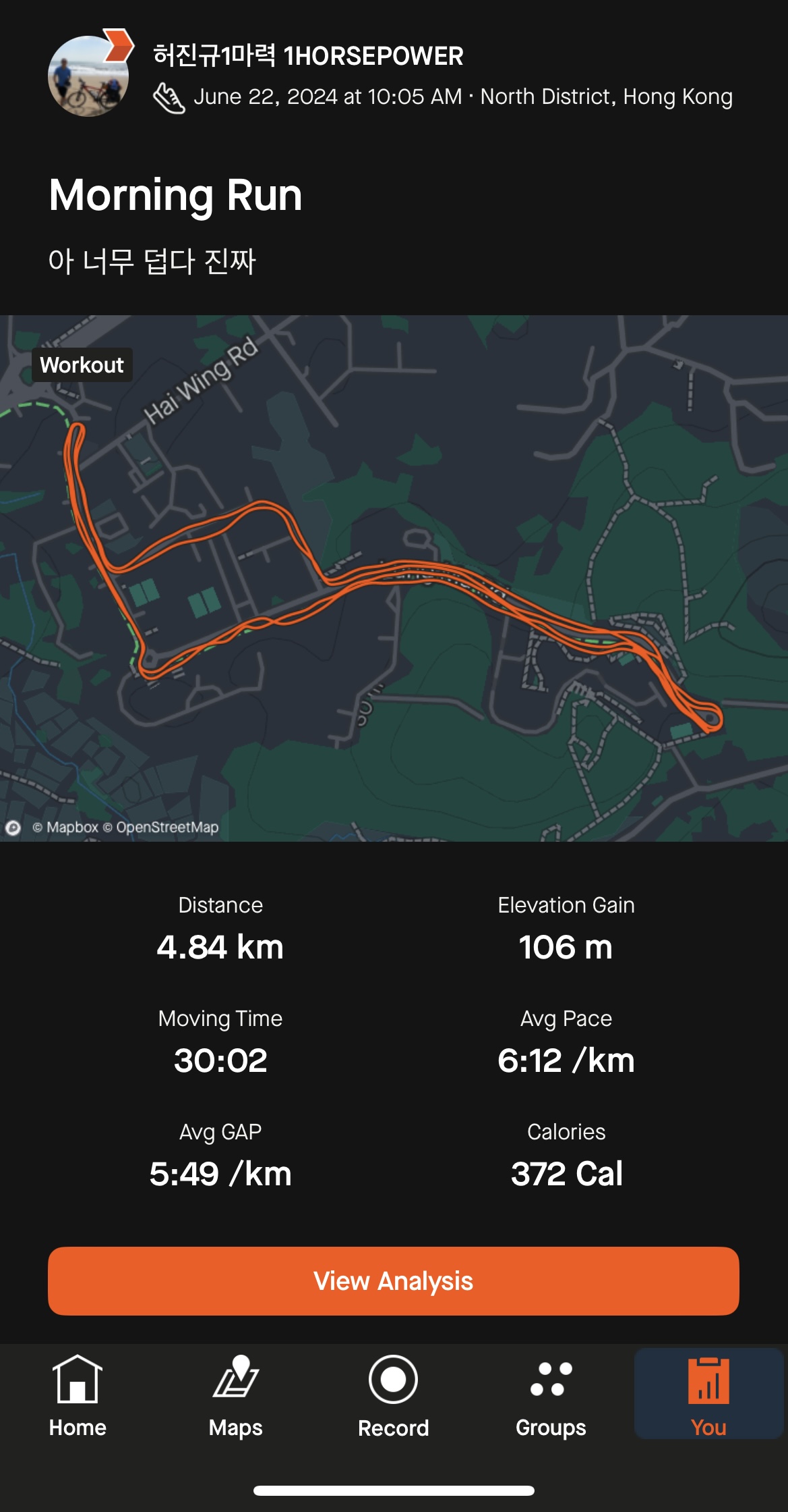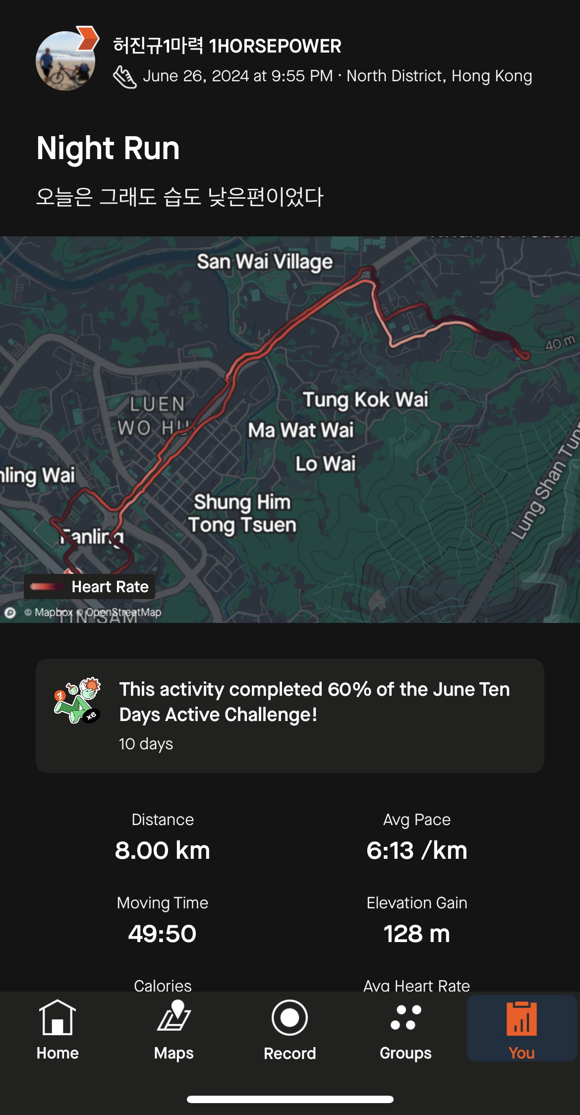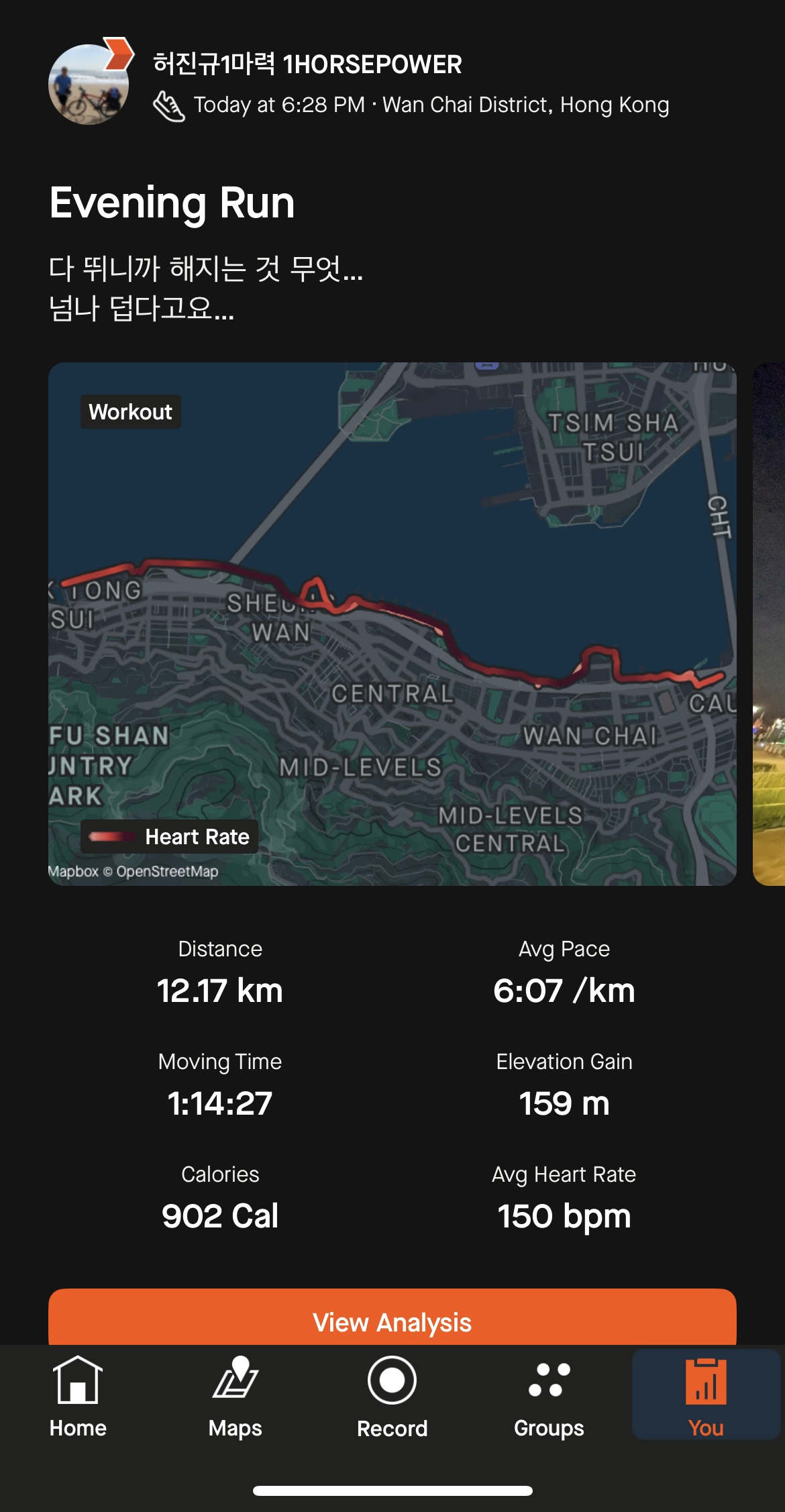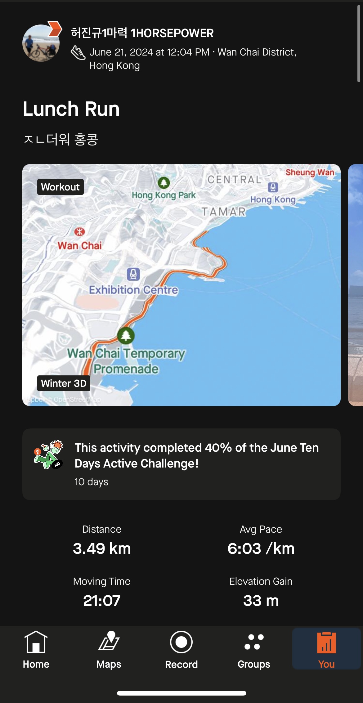 6월 이니까 6번 달렸어요. 뭐 더 발전 시킷 생각은 없고 이거라도 안뛰면 언제든지 객사 할 수 있어서 뛰는 건데 혼자 뛰는 건 넘 심심해 ㅠ 완차이 빅토리아 하버 같이 뛸 사람 구합니다.