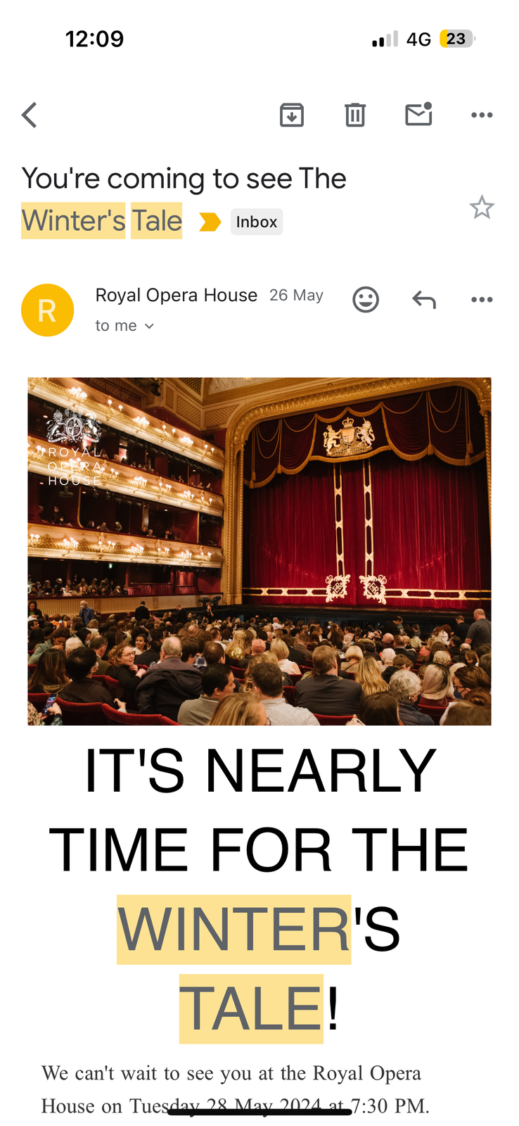 오늘 royal opera house 에서 하는 the winter's tale Amphitheatre row g 68, 69 각각 45파운드에 판매합니다 (7시 반 시작)! 표 qr 코드여서 카톡이나 메시지로 거래가능합니닷 !