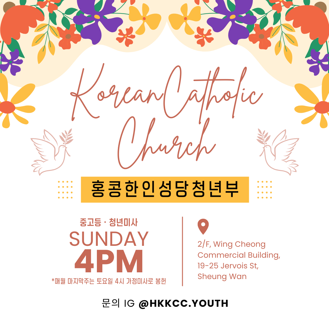 홍콩 교구 성당 관련 정보 올려드립니다 <미사시간 안내> 이번주 미사는 초,중고등 & 청년 미사는 9월 7일(일요일) 오후 4:00시입니다. (일반 성인 미사는 오전 10시입니다.) 위치: 2/F, Wing Cheong Commercial Building, 19-25 Jervois St, Sheung Wan <예비신자 모집> 2025년 9월부터 예비자 교리가 시작됩니다. • 교리기간 : 2025년 9월 ~ 2026년 3월31일 • 세례성사 : 2026년 4월4일(토) 저녁8시 • 신청: 신청서는 주보대와 성당 카페에 있습니다. • 문의: 봉사자 대표 이고운 수산나 카톡ID : bluet007